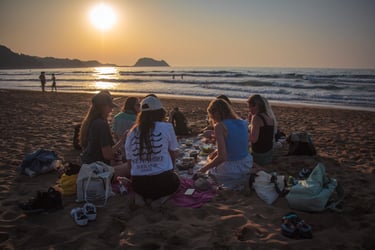 Birželio 15 - 18 d. bangų dienos. Rytais jogos, kvėpavimo ir meditacijos praktikos, maistingi pusryčiai, 1,5 val banglenčių pamokų su instruktoriumi (viso 4 pamokų dienos), 1 riedlenčių pamoka bei neribotas laikas savarankiškai gaudyti bangas. Tyrinėjame apylinkes, mėgaujamės Šiaurinės Ispanijos pakrante ir maistu.